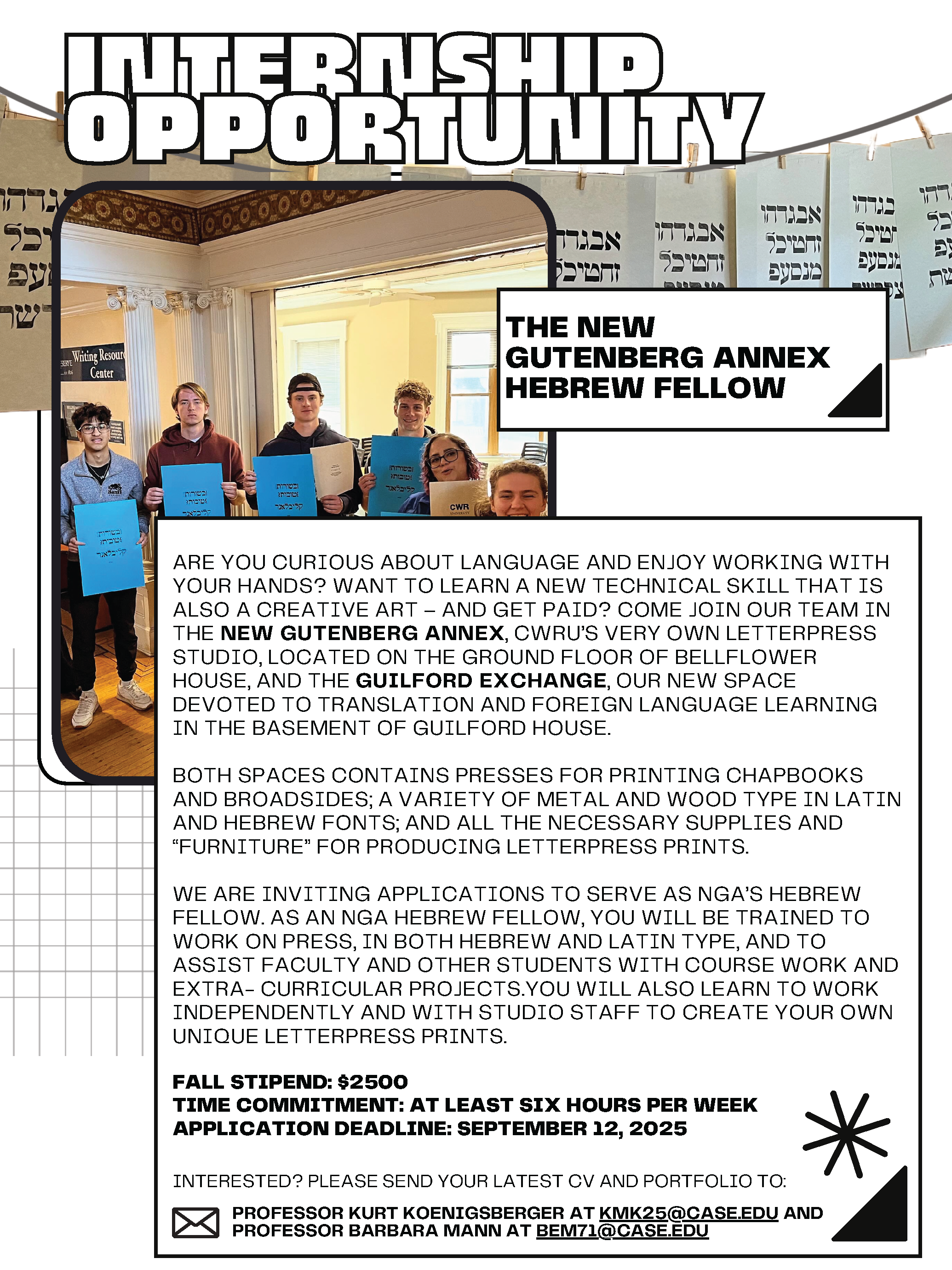 Are you curious about language and enjoy working with your hands? Want to learn a new technical skill that is also a creative art – and get paid? Come join our team in the new Gutenberg annex, CWRU’s very own letterpress studio, located on the ground floor of Bellflower