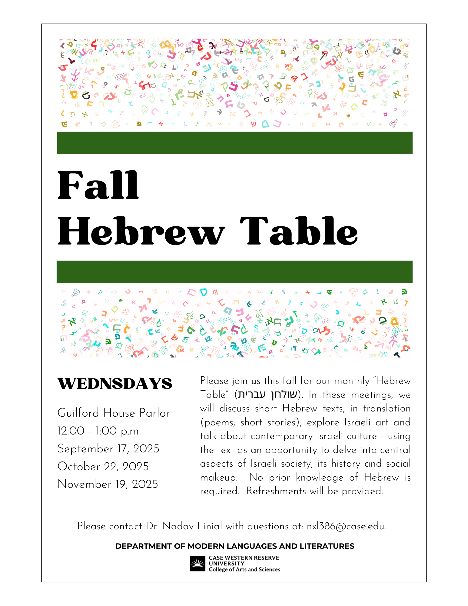 Please join us this fall for our monthly “Hebrew Culture Table.” In these meetings, we will discuss short Hebrew texts, in translation (poems, short stories), explore Israeli art, and talk about contemporary Israeli culture – using the text as an opportunity to delve into central aspects of Israeli society, its history and social makeup. No prior knowledge of Hebrew is required. Refreshments will be provided.