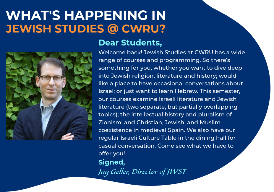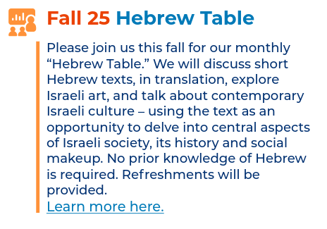 Please join us this fall for our monthly “Hebrew Culture Table.” In these meetings, we will discuss short Hebrew texts, in translation (poems, short stories), explore Israeli art, and talk about contemporary Israeli culture – using the text as an opportunity to delve into central aspects of Israeli society, its history and social makeup. No prior knowledge of Hebrew is required. Refreshments will be provided.